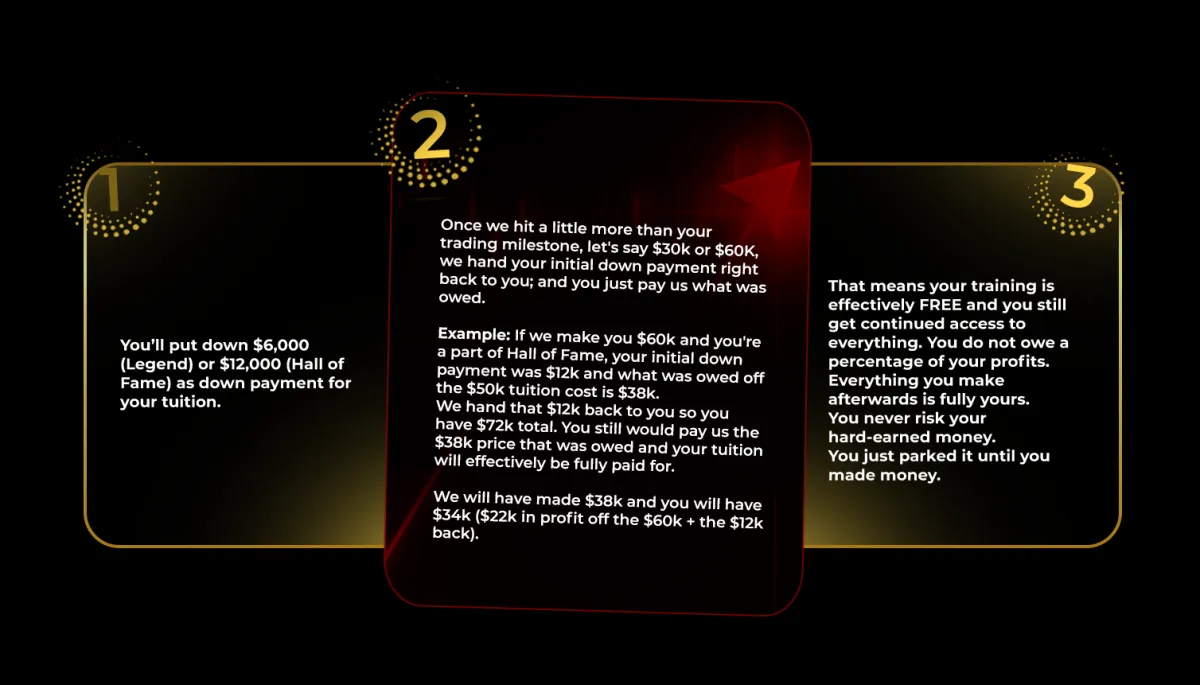 win-win mentorship that no industry leader has ever done before. The rest of the tuition that is owed will not be due unless I help you make that money back and more. No monthly membership, no annual fees. Just pure trading together, learning together, and growing together. We can't make money outside of your down payment unless you do.